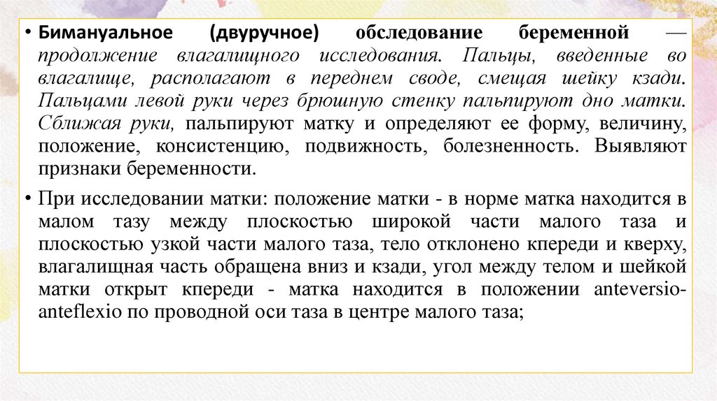 Сближая руки, пальпируют матку и определяют ее форму, величину,