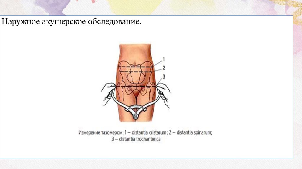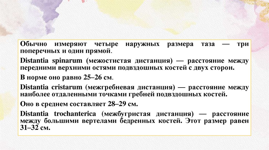 Обычно измеряют четыре наружных размера таза — трипоперечных и один прямой.