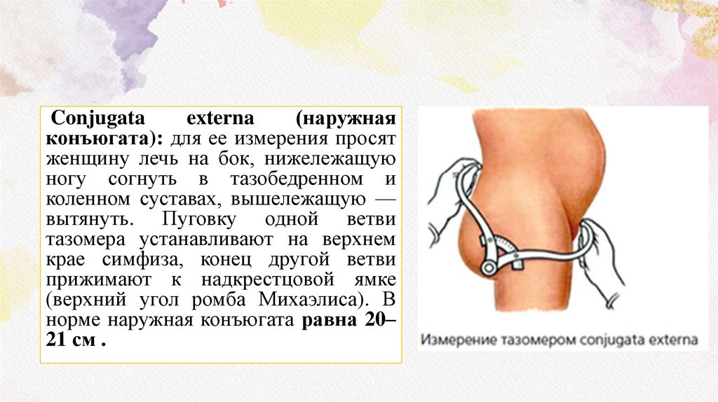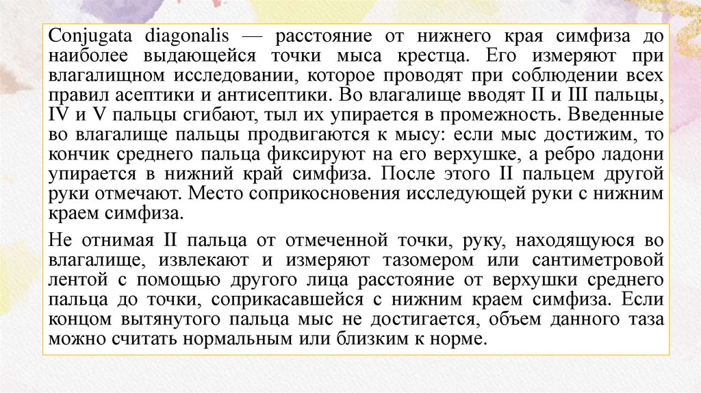 Conjugata diagonalis — расстояние от нижнего края симфиза донаиболее выдающейся точки мыса крестца. Его измеряют при