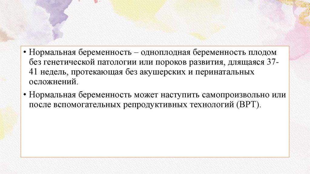 • Нормальная беременность – одноплодная беременность плодомбез генетической патологии или пороков развития, длящаяся 3741 недель, протекающая без акушерских и перинатальных