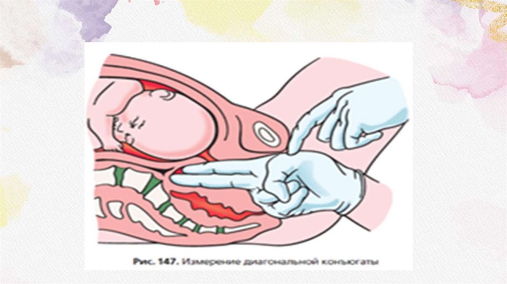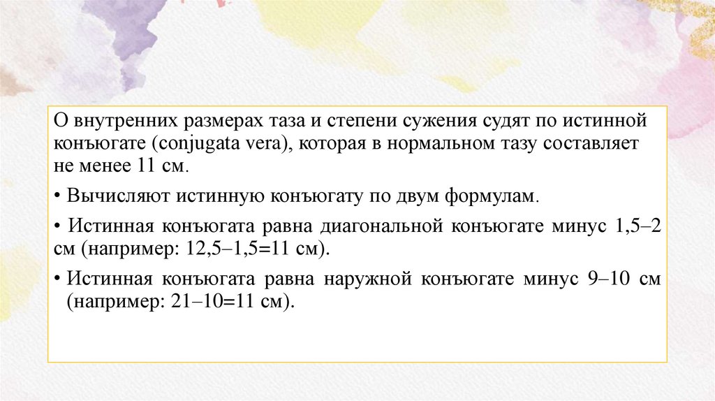 • Истинная конъюгата равна наружной конъюгате минус 9–10 см