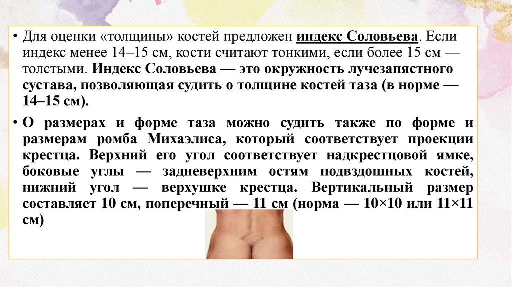 • Для оценки «толщины» костей предложен индекс Соловьева. Еслииндекс менее 14–15 см, кости считают тонкими, если более 15 см —