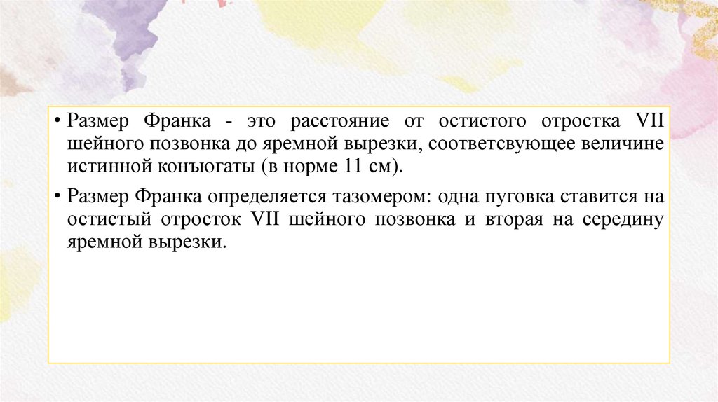 • Размер Франка - это расстояние от остистого отростка VIIшейного позвонка до яремной вырезки, соответсвующее величине