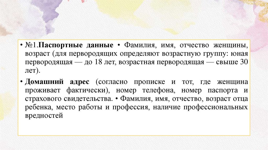 • №1.Паспортные данные • Фамилия, имя, отчество женщины,возраст (для первородящих определяют возрастную группу: юная