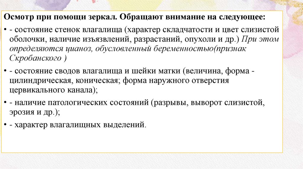 Осмотр при помощи зеркал. Обращают внимание на следующее:• - состояние стенок влагалища (характер складчатости и цвет слизистой