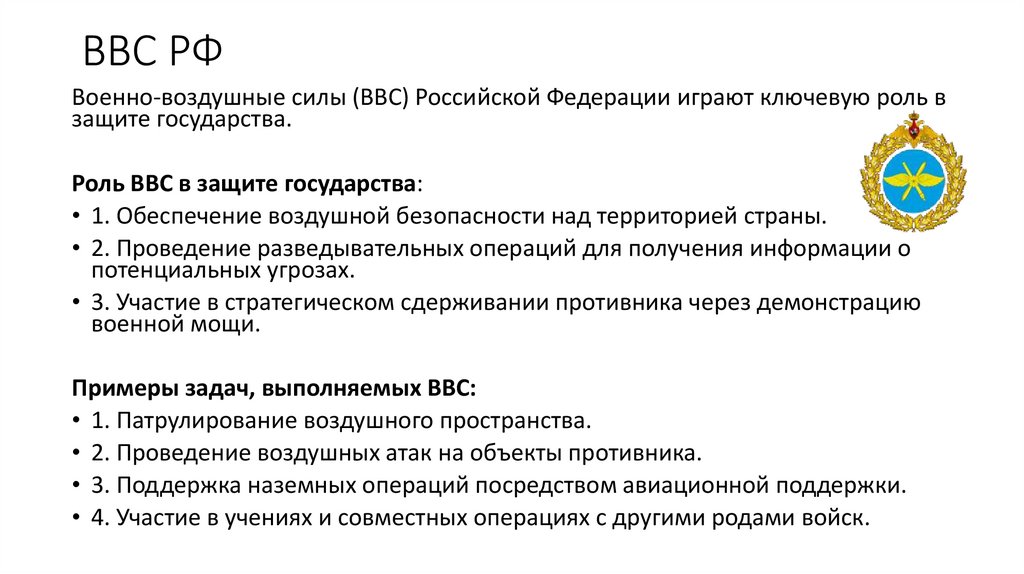 ВВС РФВоенно-воздушные силы (ВВС) Российской Федерации играют ключевую роль в