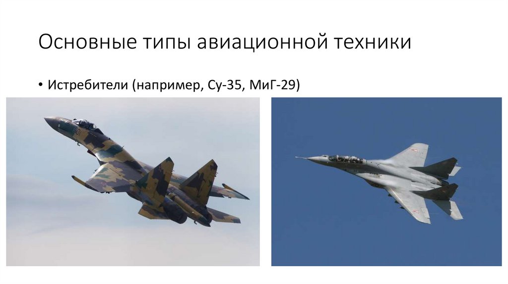 Основные типы авиационной техники• Истребители (например, Су-35, МиГ-29)