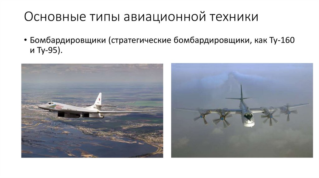 Основные типы авиационной техники• Бомбардировщики (стратегические бомбардировщики, как Ту-160