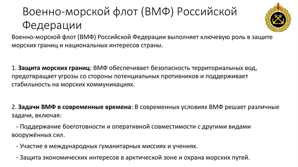 2. Задачи ВМФ в современные времена: В современных условиях ВМФ решает различные