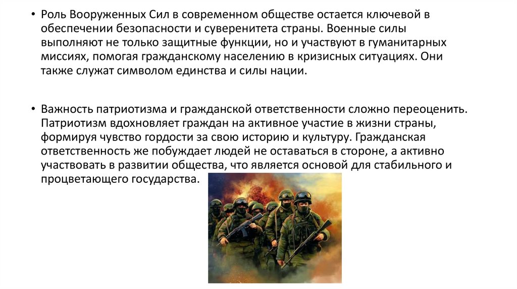 • Роль Вооруженных Сил в современном обществе остается ключевой вобеспечении безопасности и суверенитета страны. Военные силы