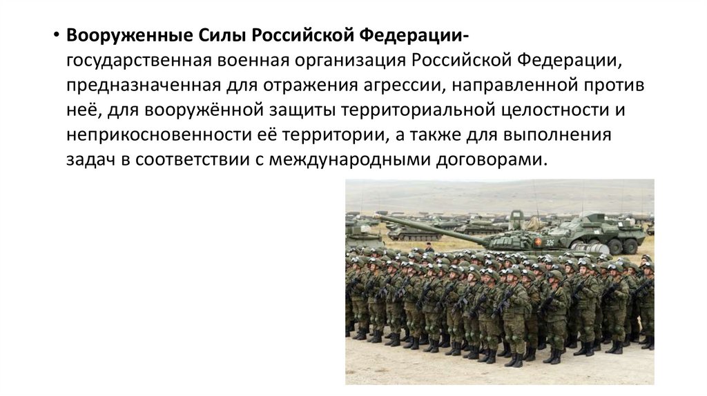 • Вооруженные Силы Российской Федерациигосударственная военная организация Российской Федерации,предназначенная для отражения агрессии, направленной против
