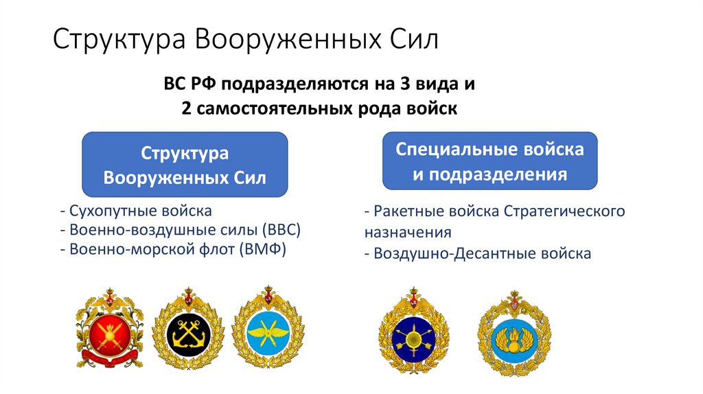Структура Вооруженных СилВС РФ подразделяются на 3 вида и