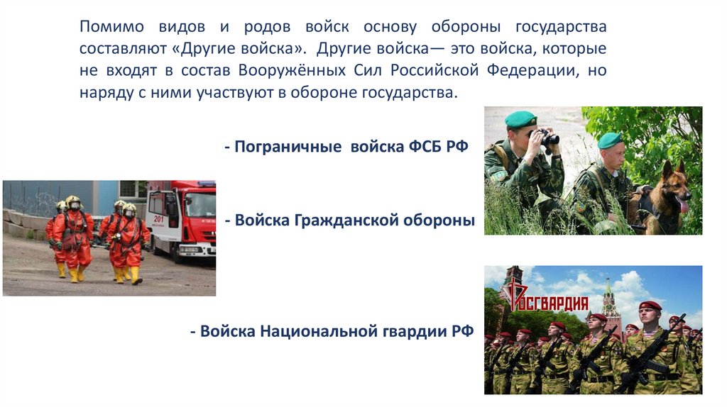 Помимо видов и родов войск основу обороны государствасоставляют «Другие войска». Другие войска— это войска, которые