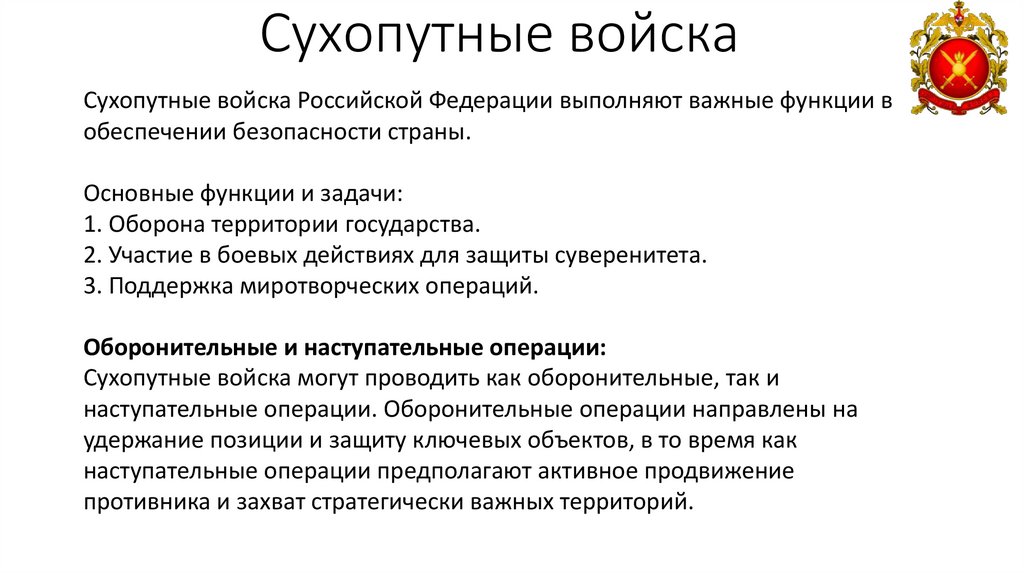 Сухопутные войскаСухопутные войска Российской Федерации выполняют важные функции в