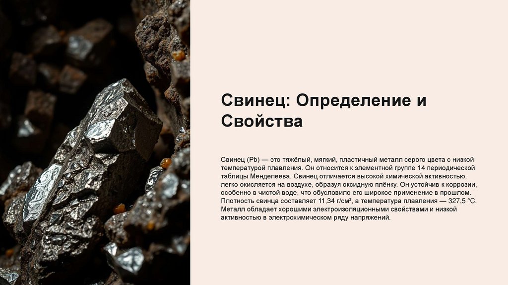 Свинец (Pb) — это тяжёлый, мягкий, пластичный металл серого цвета с низкой