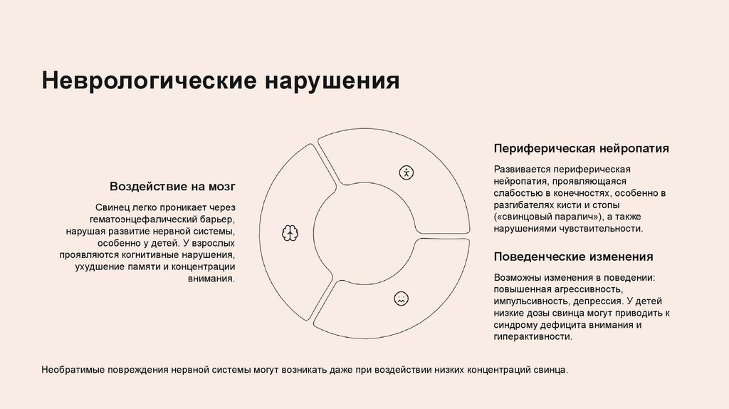 Необратимые повреждения нервной системы могут возникать даже при воздействии низких концентраций свинца.