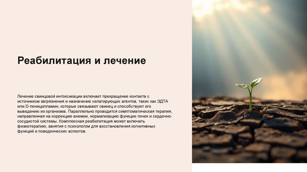 Реабилитация и лечениеЛечение свинцовой интоксикации включает прекращение контакта с