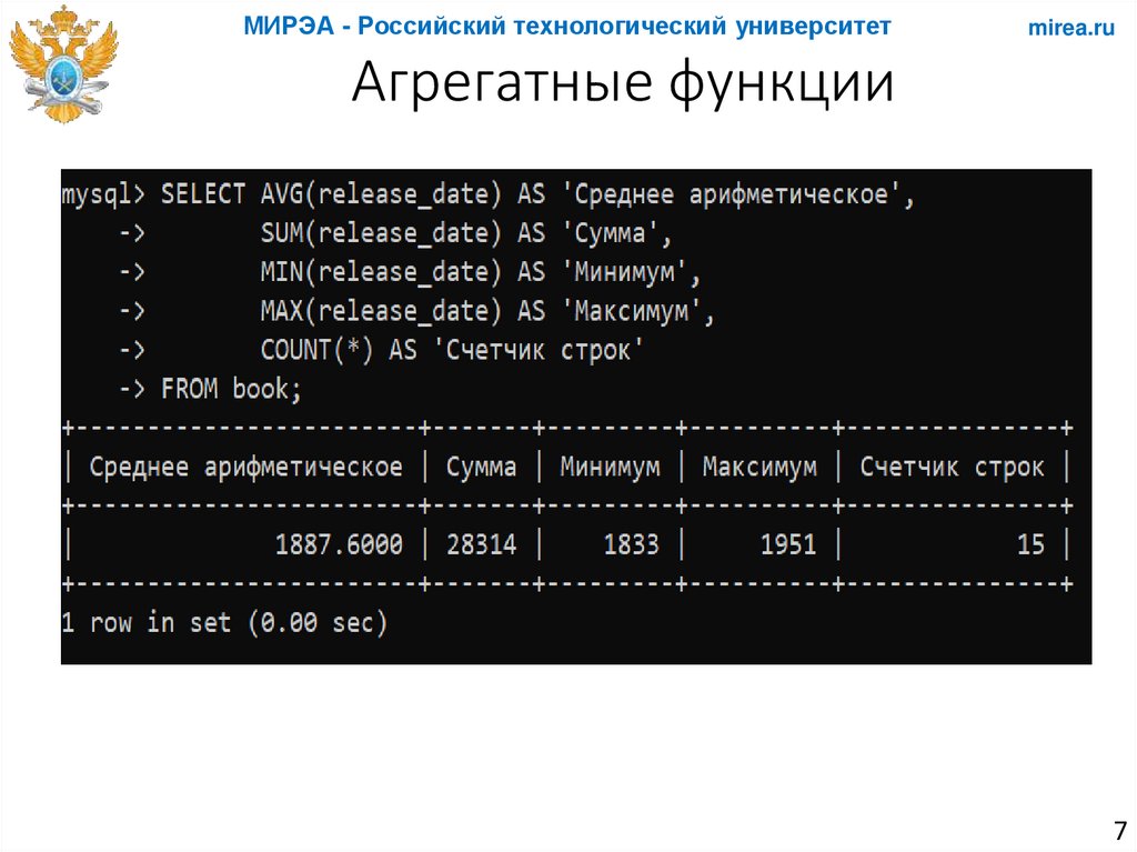 наборе строк. В MySQL есть следующие агрегатные функции: