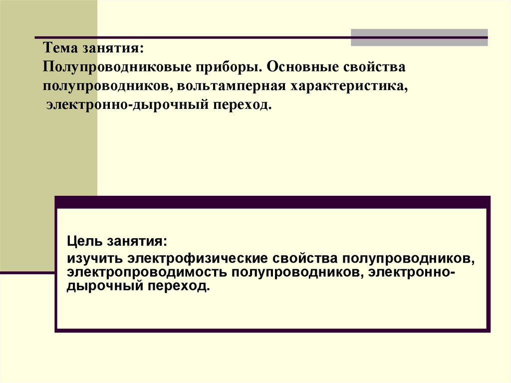 1. Тема занятия: Полупроводниковые приборы. Основные свойства полупроводников, вольтамперная характеристика, электронно-дырочный
