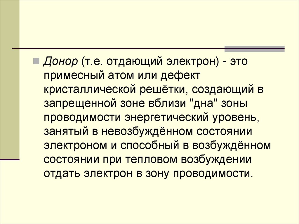 Донор (т.е. отдающий электрон) - этопримесный атом или дефект