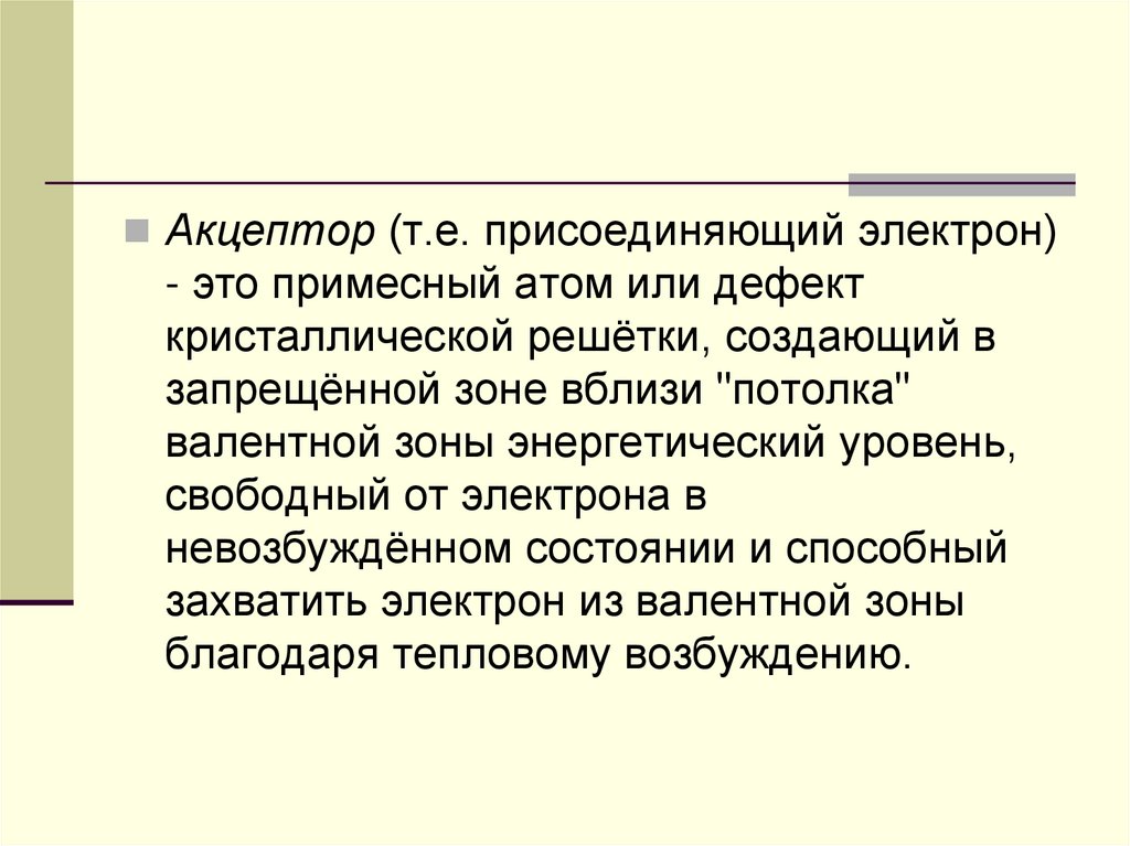 Акцептор (т.е. присоединяющий электрон)- это примесный атом или дефект