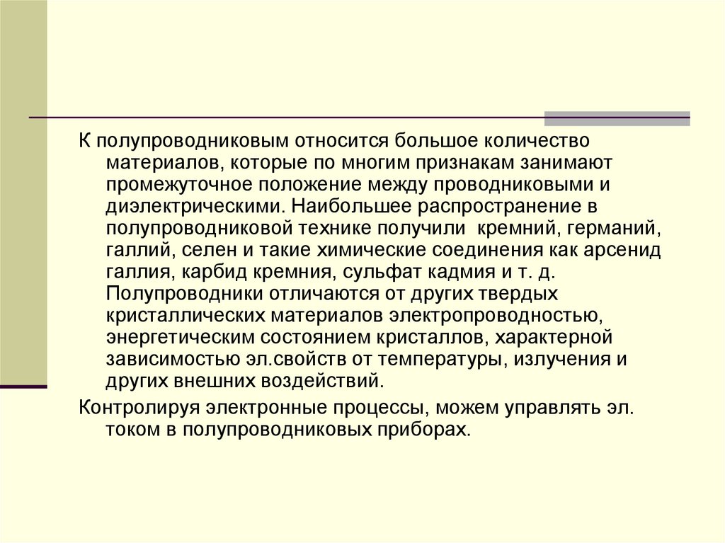 К полупроводниковым относится большое количествоматериалов, которые по многим признакам занимают