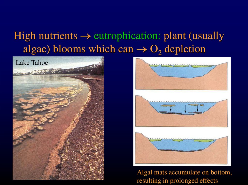High nutrients eutrophication: plant (usuallyalgae) blooms which can O2 depletion
