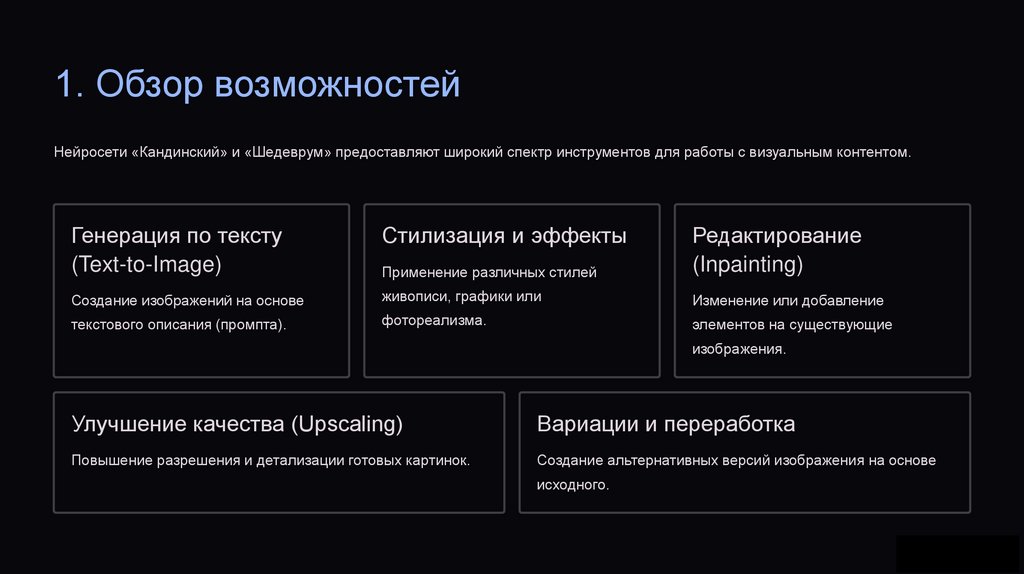 1. Обзор возможностейНейросети «Кандинский» и «Шедеврум» предоставляют широкий спектр инструментов для работы с визуальным контентом.