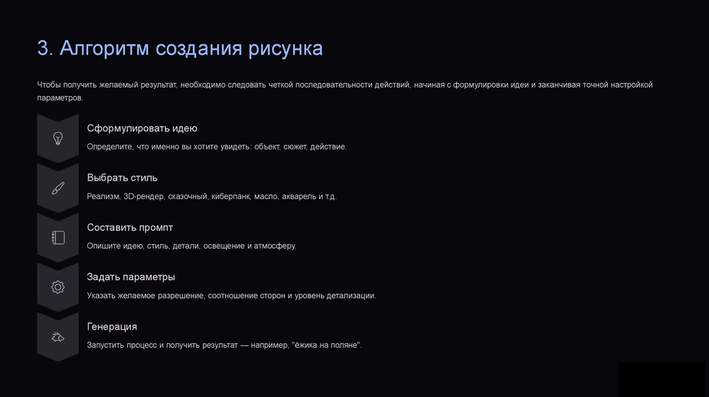 3. Алгоритм создания рисункаЧтобы получить желаемый результат, необходимо следовать четкой последовательности действий, начиная с формулировки идеи и заканчивая точной настройкой