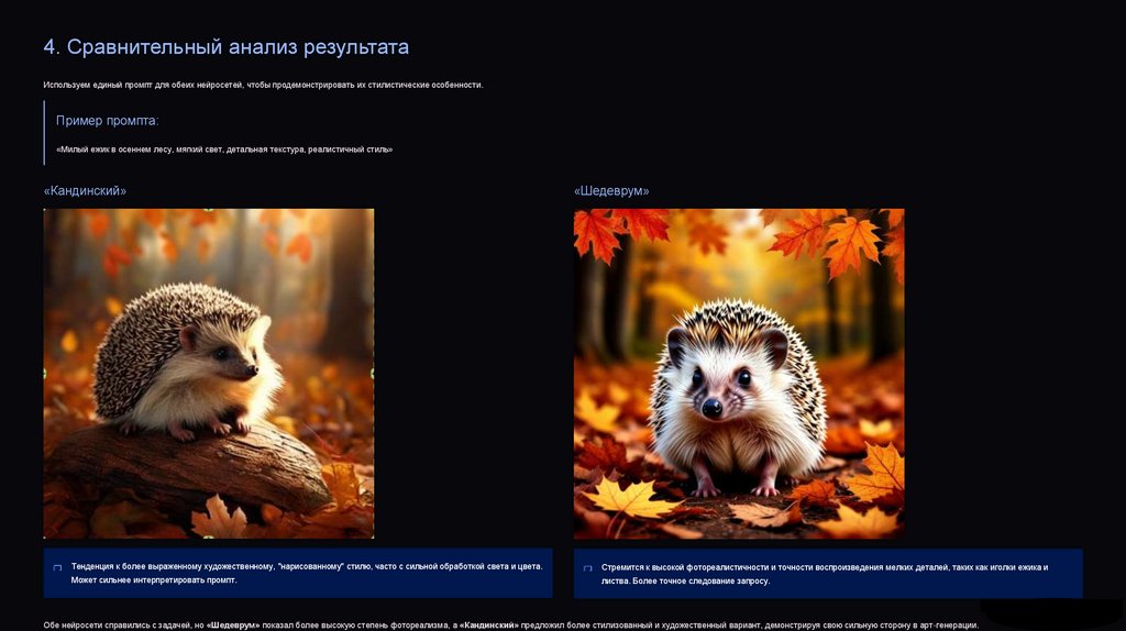 Обе нейросети справились с задачей, но «Шедеврум» показал более высокую степень фотореализма, а «Кандинский» предложил более стилизованный и художественный вариант, демонстрируя свою сильную сторону в арт-генерации.