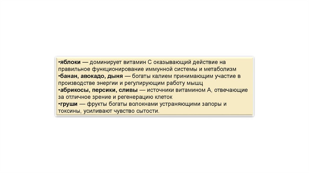 •яблоки — доминирует витамин С оказывающий действие направильное функционирование иммунной системы и метаболизм
