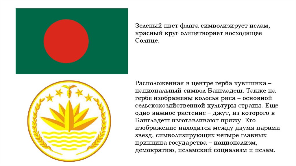 Зеленый цвет флага символизирует ислам,красный круг олицетворяет восходящее