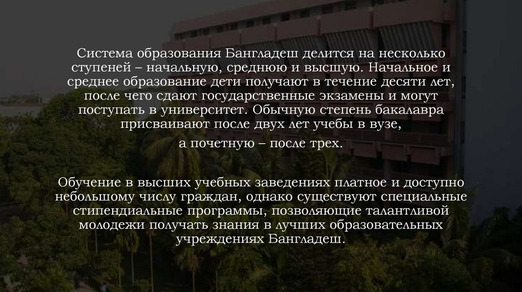 Система образования Бангладеш делится на несколькоступеней – начальную, среднюю и высшую. Начальное и