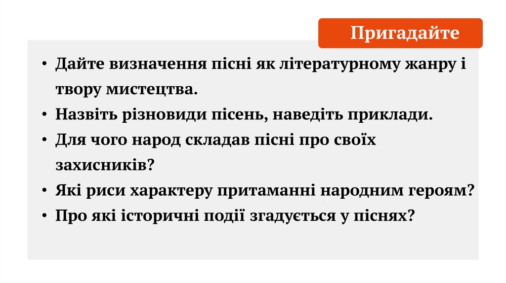 Пригадайте• Дайте визначення пісні як літературному жанру і