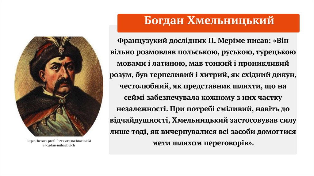 Богдан ХмельницькийФранцузукий дослідник П. Меріме писав: «Він