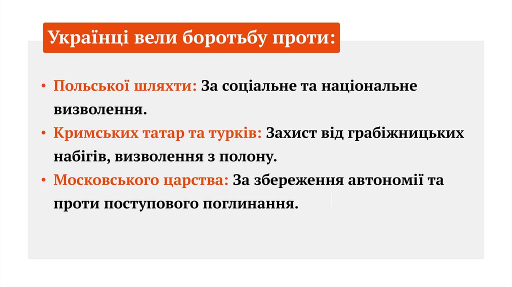 Українці вели боротьбу проти:• Польської шляхти: За соціальне та національне