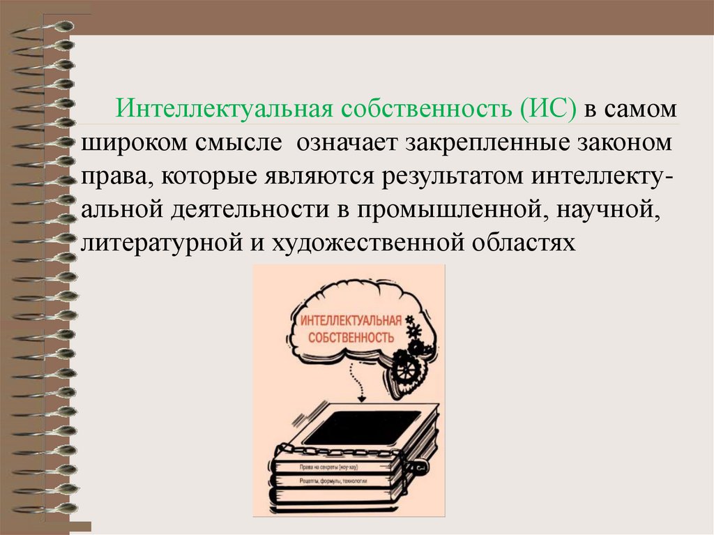Интеллектуальная собственность (ИС) в самомшироком смысле означает закрепленные законом