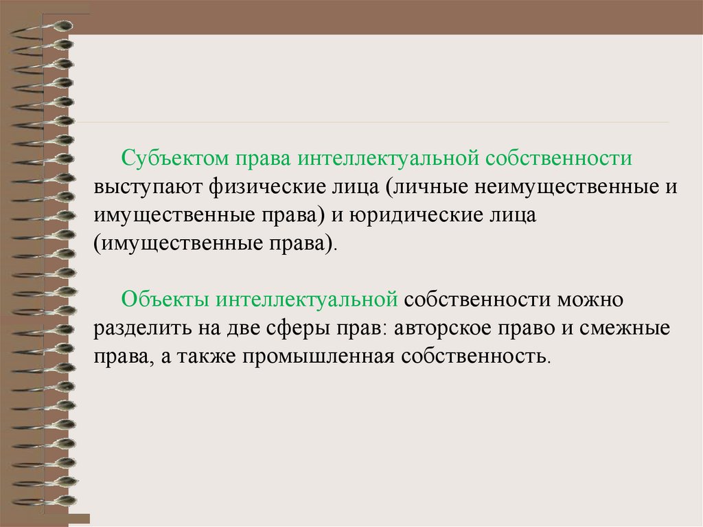 Субъектом права интеллектуальной собственностивыступают физические лица (личные неимущественные и