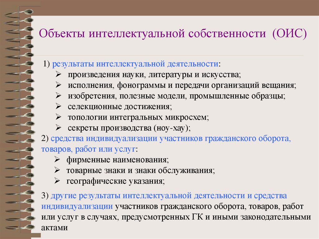 Объекты интеллектуальной собственности (ОИС)1) результаты интеллектуальной деятельности: