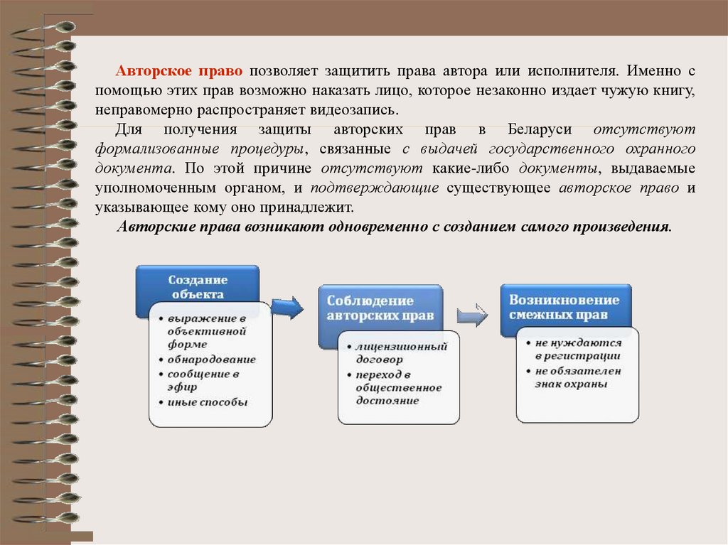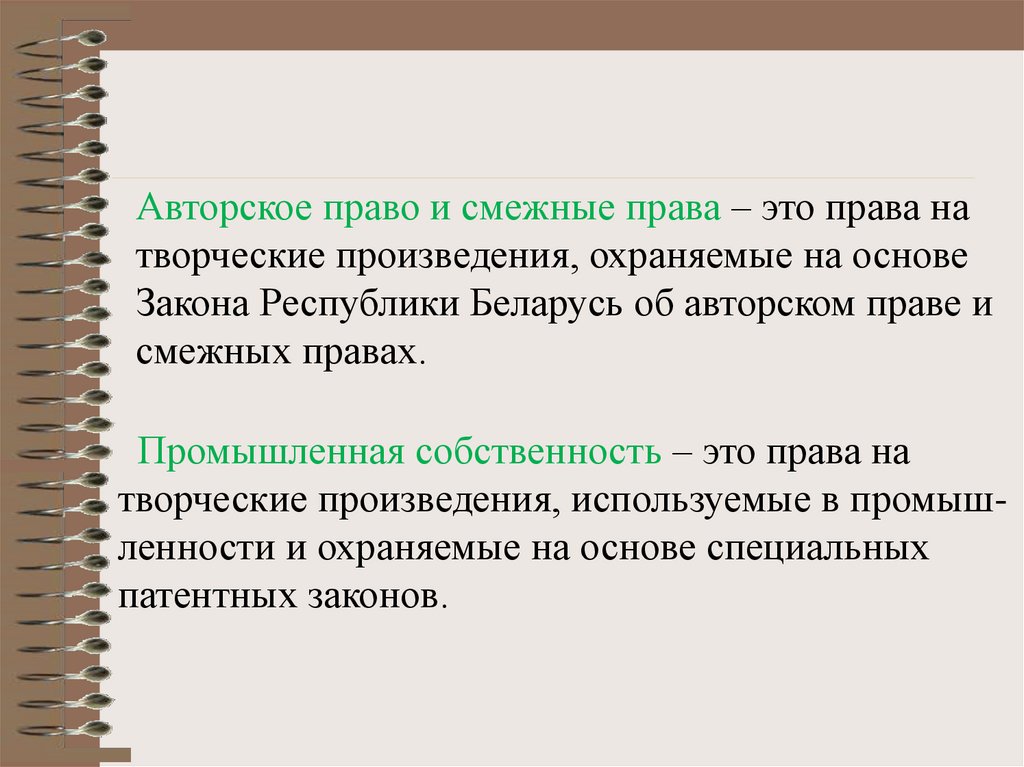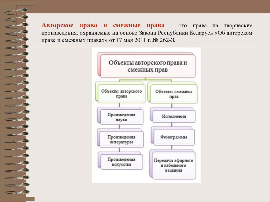 Авторское право и смежные права – это права на творческиепроизведения, охраняемые на основе Закона Республики Беларусь «Об авторском