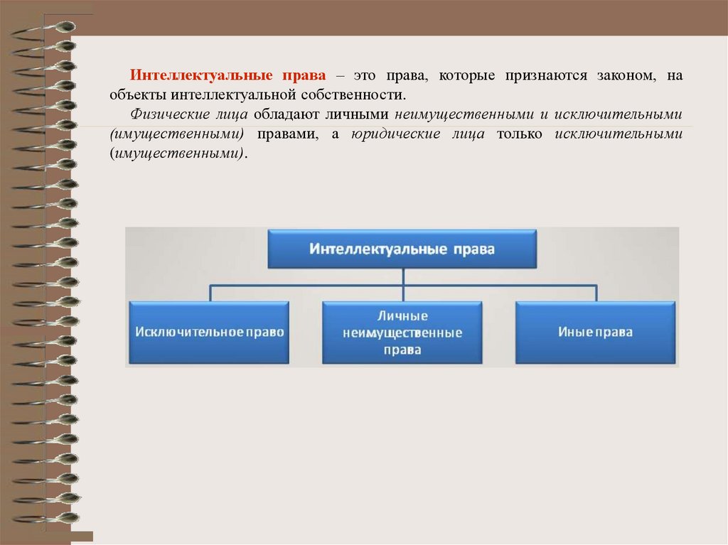 Интеллектуальные права – это права, которые признаются законом, наобъекты интеллектуальной собственности.