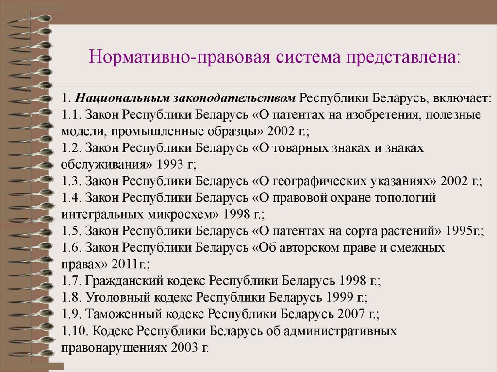 Нормативно-правовая система представлена:1. Национальным законодательством Республики Беларусь, включает: