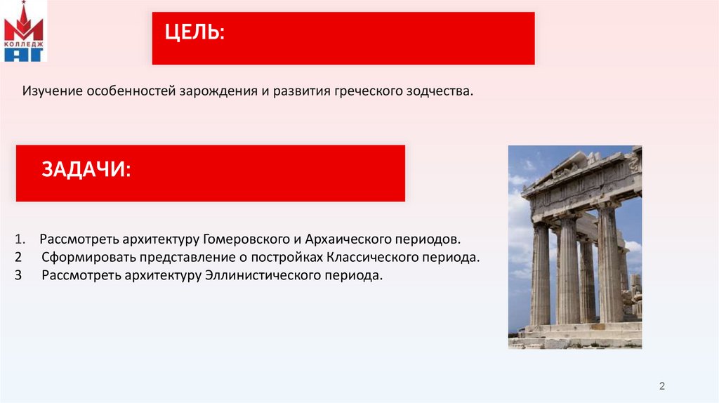 ЦЕЛЬ:Изучение особенностей зарождения и развития греческого зодчества.
