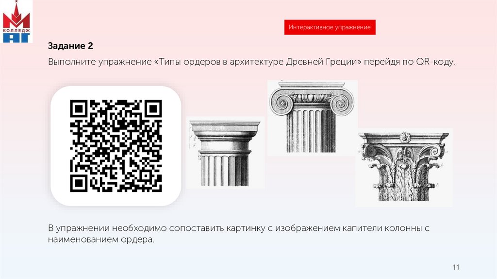 Выполните упражнение «Типы ордеров в архитектуре Древней Греции» перейдя по QR-коду.