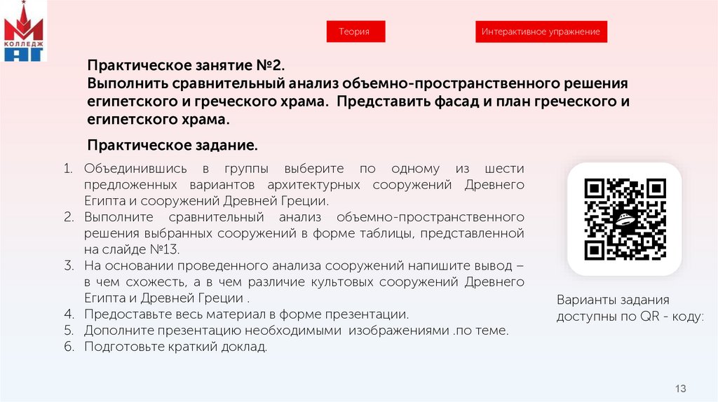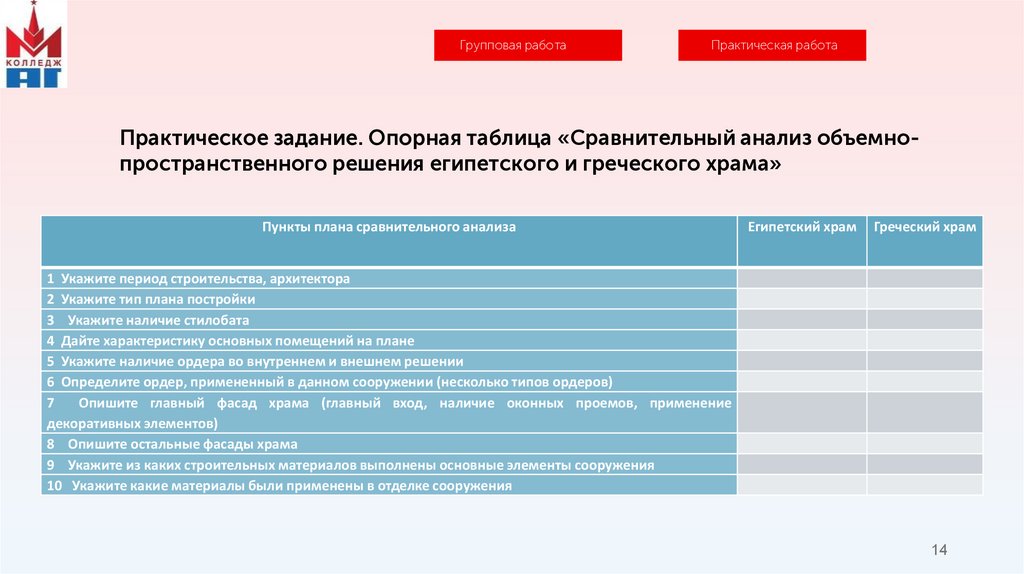 Практическое задание. Опорная таблица «Сравнительный анализ объемнопространственного решения египетского и греческого храма»