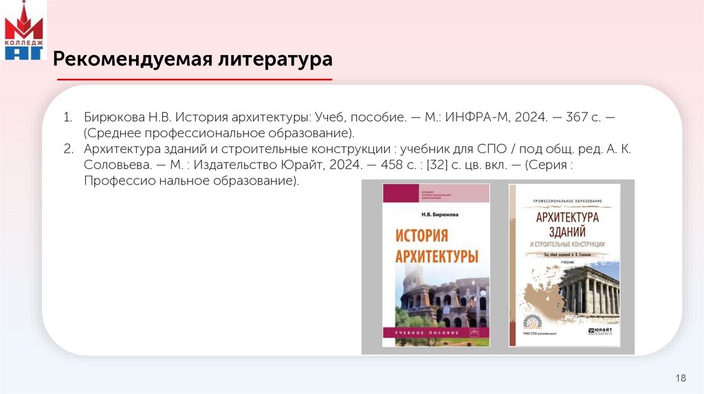 Рекомендуемая литература1. Бирюкова Н.В. История архитектуры: Учеб, пособие. — М.: ИНФРА-М, 2024. — 367 с. —