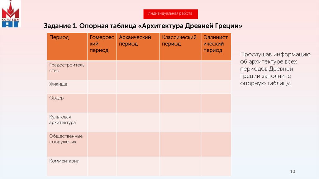 Индивидуальная работаЗадание 1. Опорная таблица «Архитектура Древней Греции»