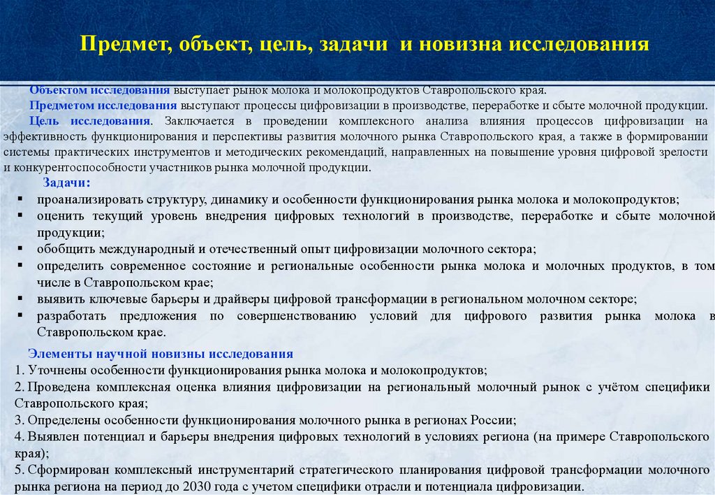 Предмет, объект, цель, задачи и новизна исследованияОбъектом исследования выступает рынок молока и молокопродуктов Ставропольского края.