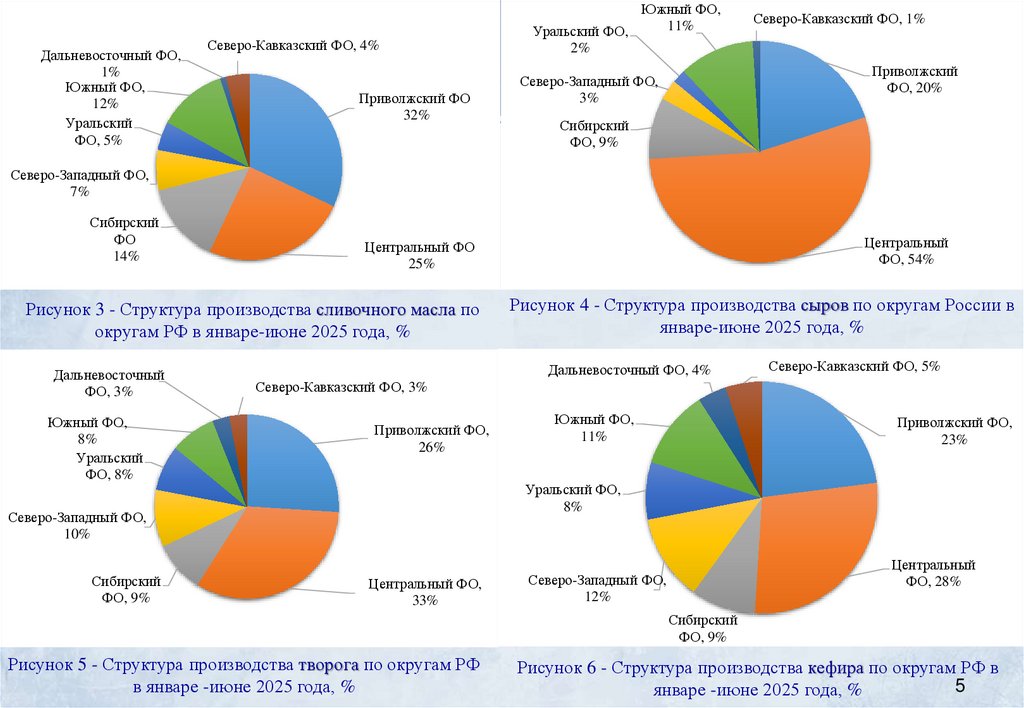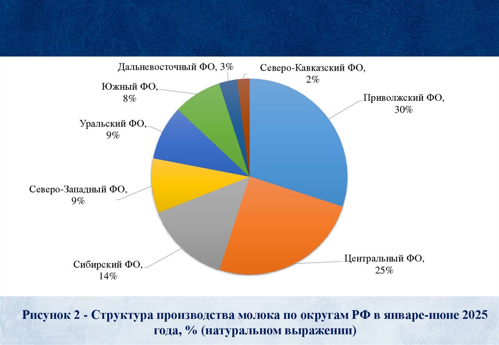Рисунок 2 - Структура производства молока по округам РФ в январе-июне 2025