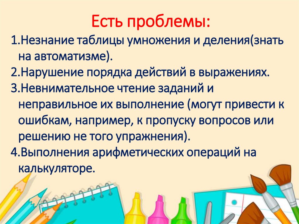 Есть проблемы:1.Незнание таблицы умножения и деления(знать